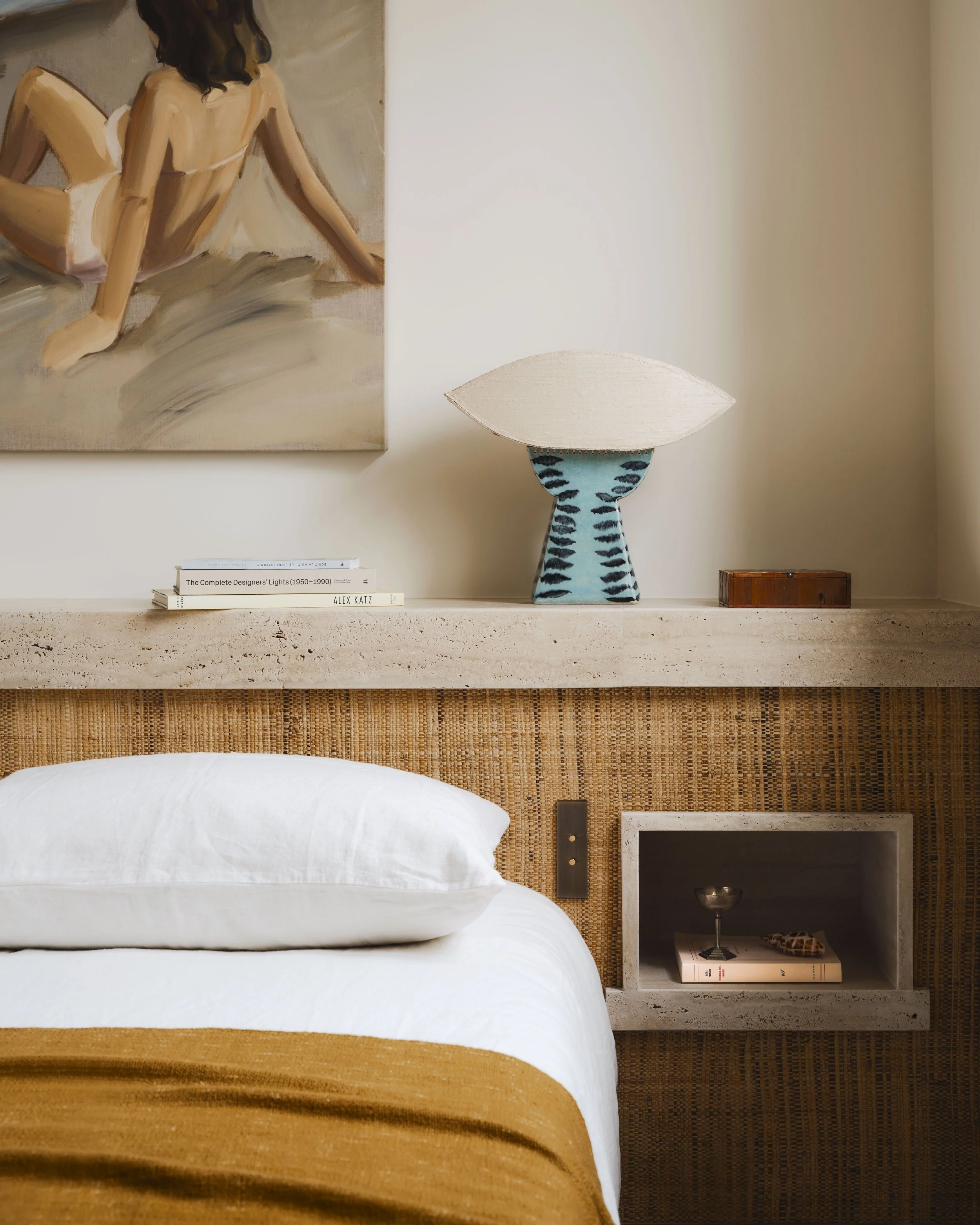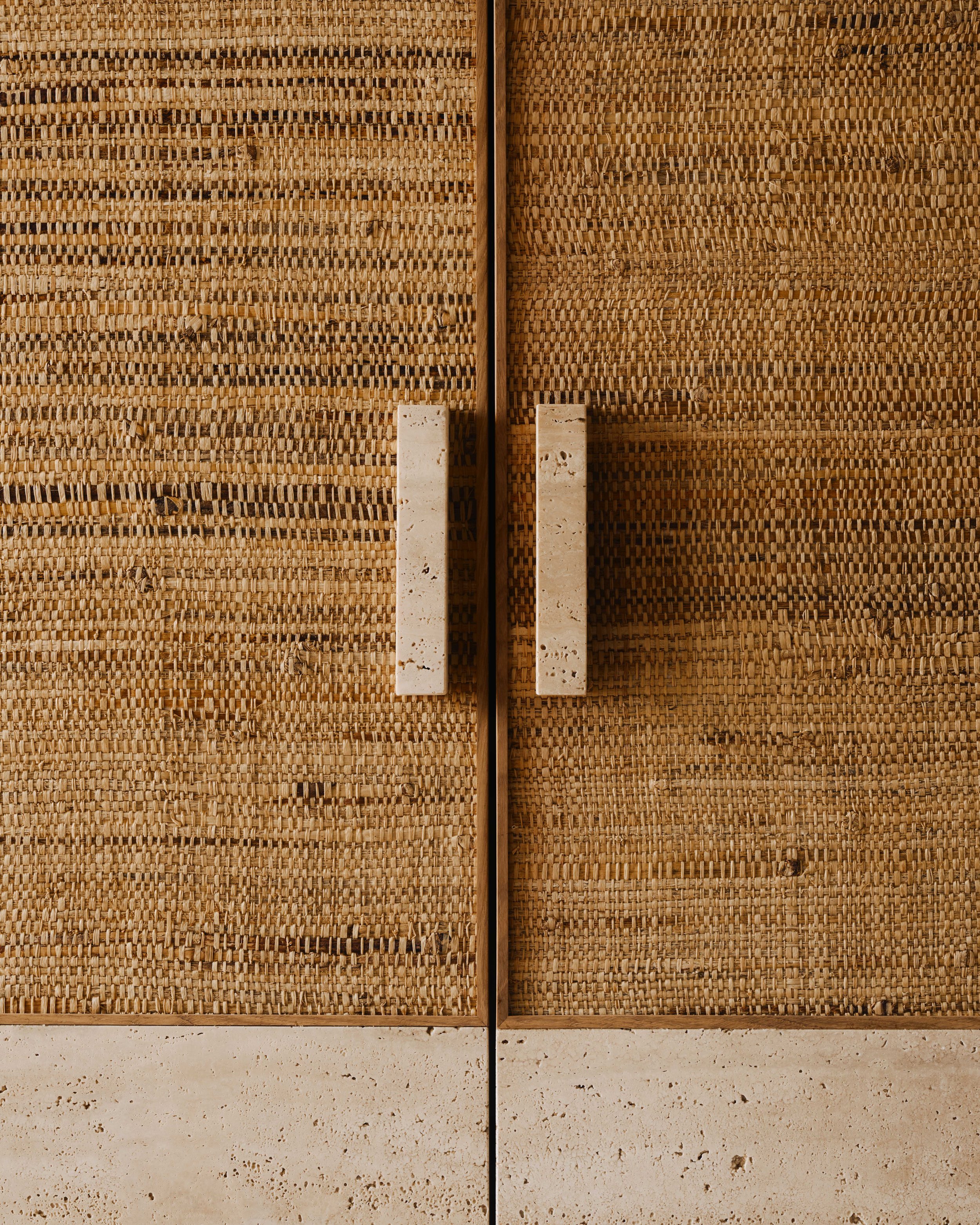 Inside, the spaces are warm and intimate. A system of curtains serves as movable partitions, allowing spaces to be modulated at will. As a nod to the pavilion’s colonial past, woodwork accents made from woven banana leaves and raffia fibers add warmth and comfort. Door frames, floor designs, and the large kitchen island subtly incorporate wood and stone to evoke the surrounding coastal landscape. The dining table, custom-designed for the project, features enamelled lava stone.