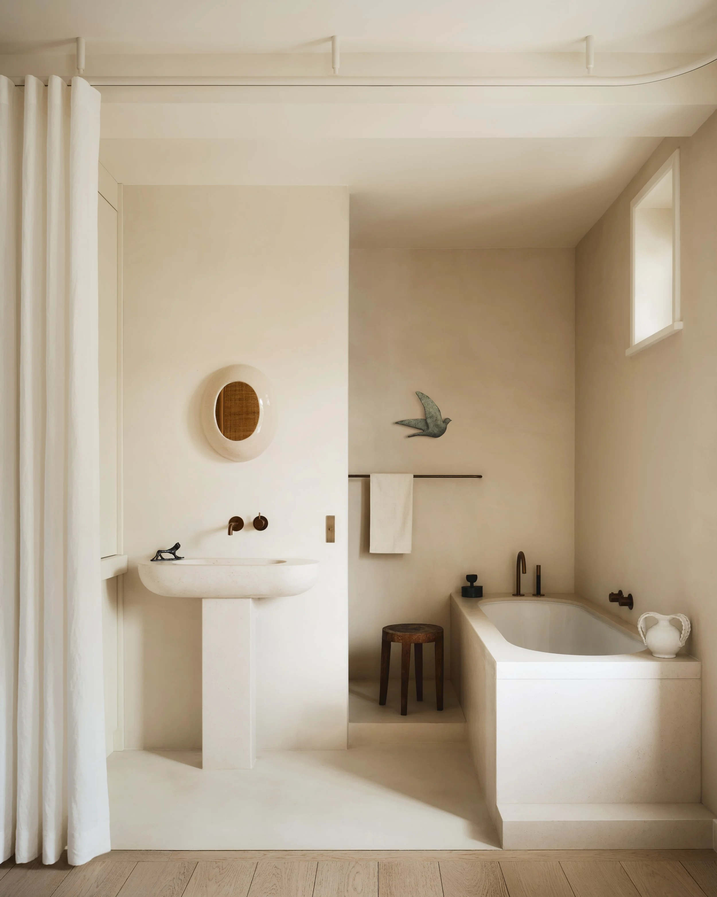 Perched on the heights of Villers-sur-Mer, overlooking the sea, the interior design embraces neutral and warm tones, extending the coastal landscape of sand and rocks indoors. The house’s gallery invites contemplation of the bay below.